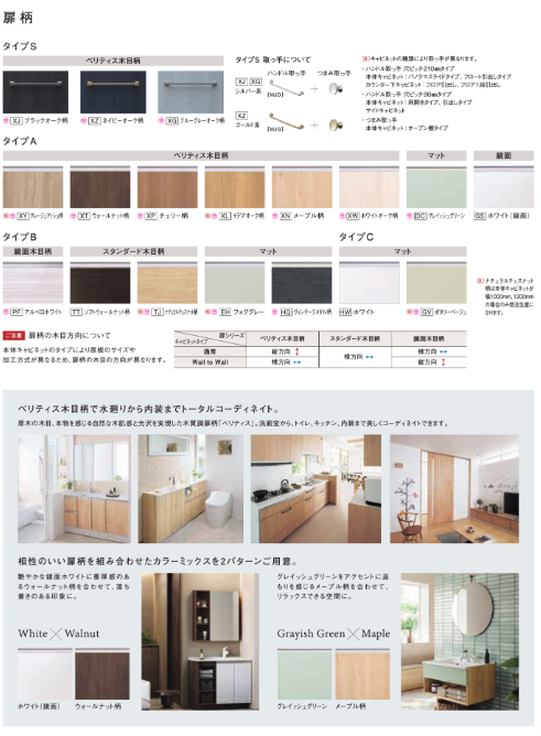 ノイズの少ない面構成と豊富な扉カラーで、床や建具とコーディネートしやすいのが特長。明るいホワイト系は清潔感、木目は温かみを演出します。