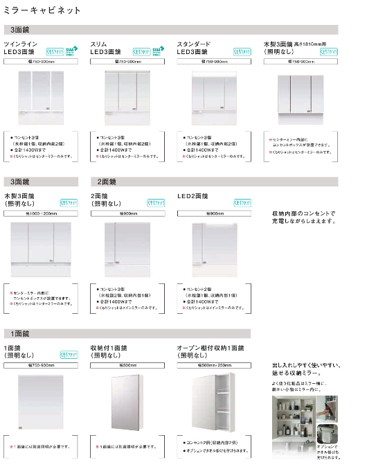 ミラー:三面鏡は収納量と角度調整に優れ、身だしなみが整えやすい。ツインラインLEDは顔全体を照らすのでメイクもしやすいです。一面鏡は圧迫感が少なく空間が広く見えます。曇り止めや内部コンセントの有無はドライヤー動線に合わせて。