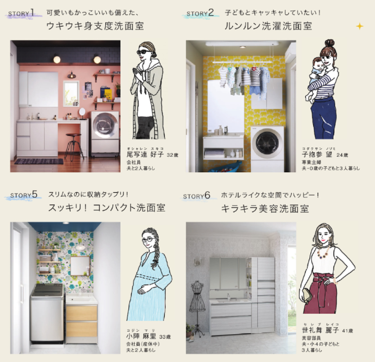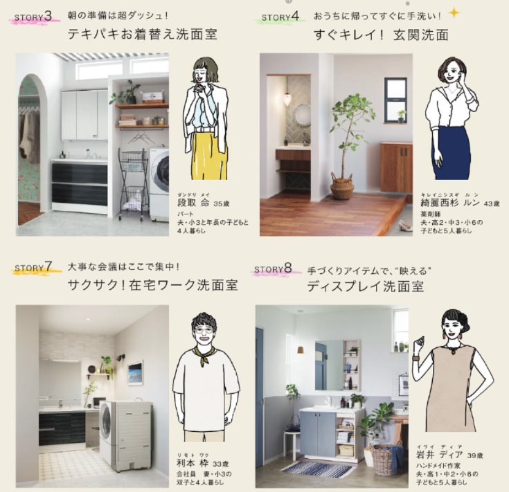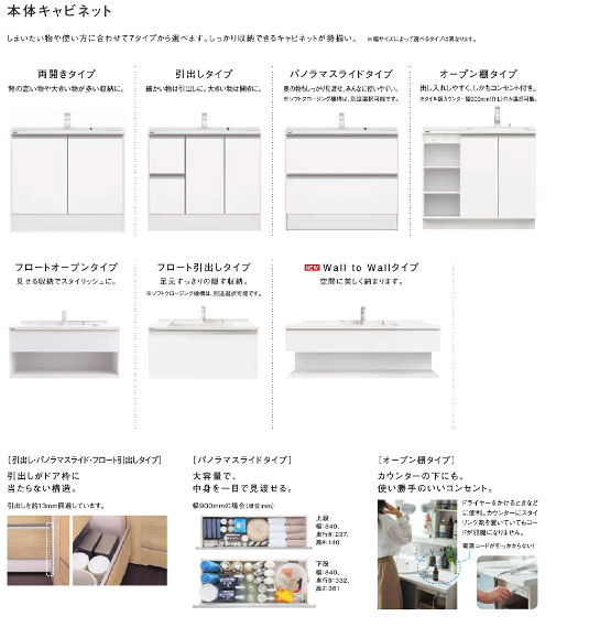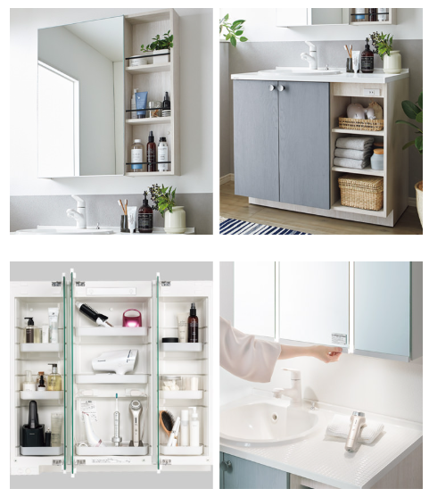 収納:おしゃれに見せる収納のフロートタイプか、見た目スッキリ開き・スライドタイプか。現在の洗面所状況も見ながら想定して容量を見積もるのがコツです。