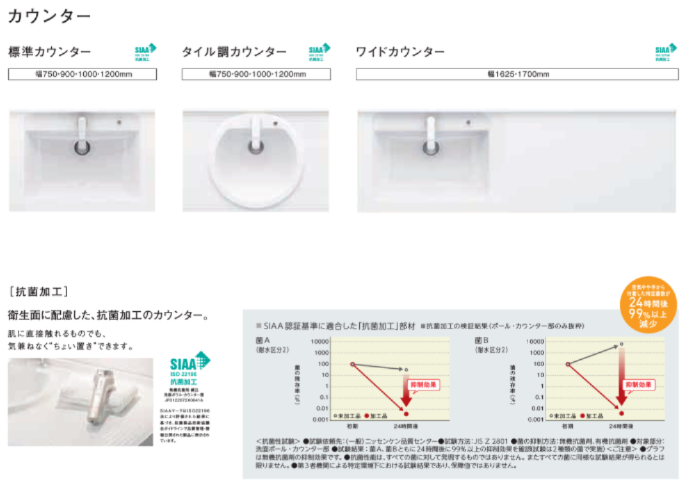 カウンター:すべてに抗菌加工が施されています。人気のタイル調カウンターや洗面室でメイクや家事をしたり、二人以上で利用する場合はワイドカウンターがおすすめです。