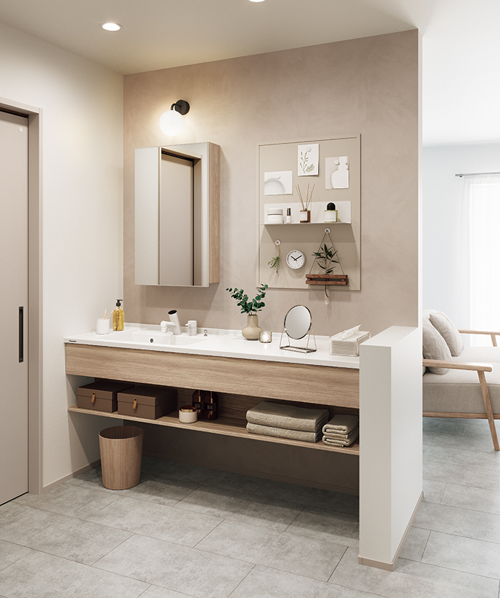 サッと出し入れしやすいオープン収納。収納付きのミラーを組み合わせて、ディスプレイも楽しめます。