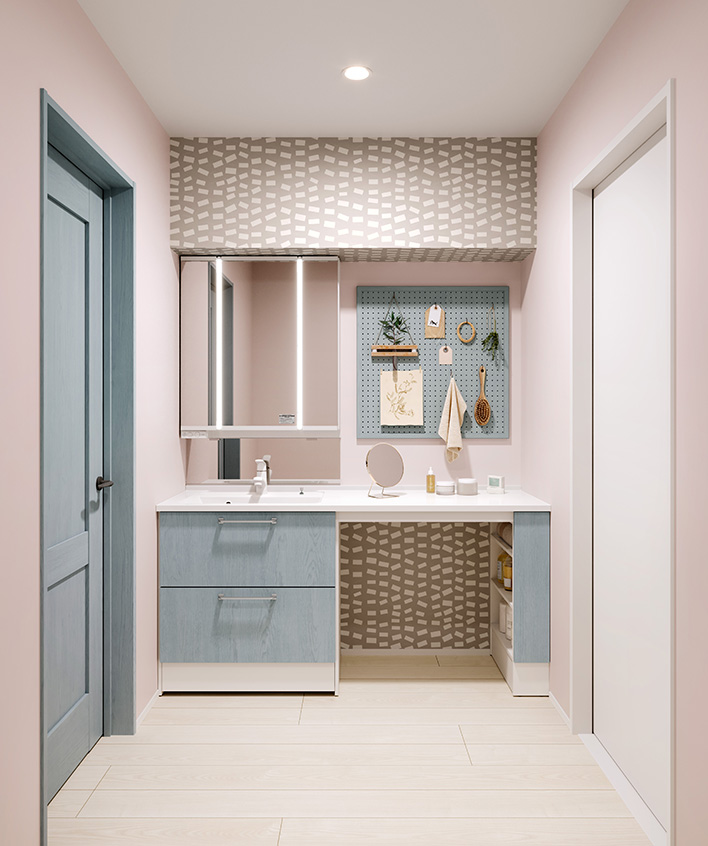 扉カラーやミラー、水栓の選択肢が広く、マンション・戸建てを問わず空間になじみます。