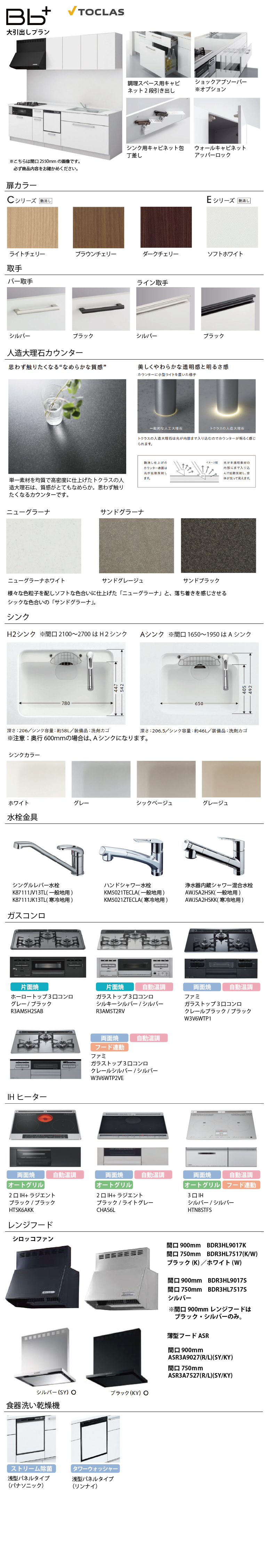 加熱機器無しをご選択の場合、加熱機器は現場支給とみなしまして穴あけ加工ありで手配いたします。水栓穴無しご希望の場合は「ストアへのご要望」欄に必ず「水栓穴無し希望」とご記入ください。また、壁出し水栓を設置される場合は奥行60cmを推奨致します。※定価、販売価格には、加熱機器・水栓の価格が含まれていない金額となりますのでご注意ください。※沖縄・離島配送不可■扉カラー ■Cシリーズ艶消しライトチェリーブラウンチェリーダークチェリー ■Eシリーズ艶消しソフトホワイト■シンクH2シンク※奥行60cmをご選択された場合はAシンクになります。■シンクカラーホワイト/グレー/シックベージュ/グレージュ■取手 ■バー取手シルバー/ブラック■人造大理石カウンター ニューグラーナホワイト/サンドグレージュ/サンドブラック■ウォールスペースアッパーロック付■水栓金具・シングルレバー水栓[一般地/寒冷地用] K87111J(V/K)13TL・ハンドシャワー水栓[一般地/寒冷地用] KM5021(Z)TECLA・浄水器内蔵シャワー混合水栓[一般地/寒冷地用] AWJSA2HSK(K)■加熱機器・ホーロートップ3口コンロ(グレー/ブラック)R3AM5H2SAB・ガラストップ3口コンロ(シルキーシルバー/シルバー)R3AM5T2RV・ファミガラストップ 3口コンロ(クレールシルバー/シルバー)W3V6WTP2VE・ファミ ガラストップ3口コンロ(クレールブラック/ブラック)W3V6WTP1・2口IH+ラジエント(ブラック/ライトグレー)CHAS6L・2口IH+ラジエント(ブラック/ブラック)HTSK6AKK・3口IH(シルバー/シルバー)HTN8STFS■レンジフード 間口900mm・シロッコファン(ブラック・シルバー)・薄型フードADR(シルバー)・薄型フードASR(ブラック/シルバー)■食器洗い乾燥機浅型パネルタイプ ストリーム除菌:NP45RS9KAA(ブラック)※奥行60cmの場合は浅型パネルタイプ タワーウォッシャー(RKWC402CAB/ブラック)になります。■レールショックアブソーバーなし/ショックアブソーバーあり
