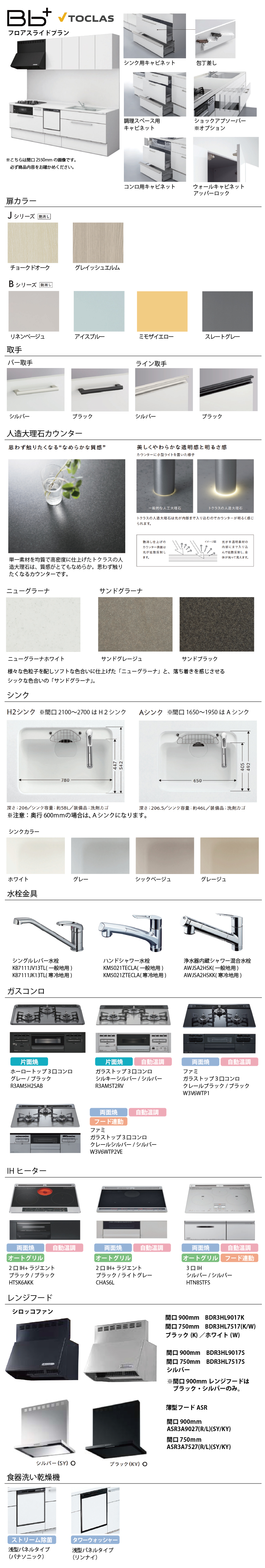 加熱機器無しをご選択の場合、加熱機器は現場支給とみなしまして穴あけ加工ありで手配いたします。水栓穴無しご希望の場合は「ストアへのご要望」欄に必ず「水栓穴無し希望」とご記入ください。また、壁出し水栓を設置される場合は奥行60cmを推奨致します。※定価、販売価格には、加熱機器・水栓の価格が含まれていない金額となりますのでご注意ください。※沖縄・離島配送不可■扉カラー ■Jシリーズ艶消しチョークドオークグレイッシュエルム ■Bシリーズ艶消しリネンベージュアイスブルーミモザイエロースレートグレー■シンクH2シンク■シンクカラーホワイト/グレー/シックベージュ/グレージュ■取手 ■バー取手シルバー/ブラック ■ライン取手シルバー/ブラック■人造大理石カウンター ニューグラーナホワイト/サンドグレージュ/サンドブラック■ウォールスペースアッパーロック付■水栓金具・シングルレバー水栓[一般地/寒冷地用] K87111J(V/K)13TL・ハンドシャワー水栓[一般地/寒冷地用] KM5021(Z)TECLA・浄水器内蔵シャワー混合水栓[一般地/寒冷地用] AWJSA2HSK(K)■加熱機器・ホーロートップ3口コンロ(グレー/ブラック)R3AM5H2SAB・ガラストップ3口コンロ(シルキーシルバー/シルバー)R3AM5T2RV・ファミガラストップ 3口コンロ(クレールシルバー/シルバー)W3V6WTP2VE・ファミ ガラストップ3口コンロ(クレールブラック/ブラック)W3V6WTP1・2口IH+ラジエント(ブラック/ライトグレー)CHAS6L・2口IH+ラジエント(ブラック/ブラック)HTSK6AKK・3口IH(シルバー/シルバー)HTN8STFS■レンジフード 間口900mm・シロッコファン(ブラック・シルバー)・薄型フードADR(シルバー)・薄型フードASR(ブラック/シルバー)■食器洗い乾燥機浅型パネルタイプ ストリーム除菌:NP45RS9KAA(ブラック)※奥行60cmの場合は浅型パネルタイプ タワーウォッシャー(RKWC402CAB/ブラック)になります。■レールショックアブソーバーなし/ショックアブソーバーあり/ブルモーション