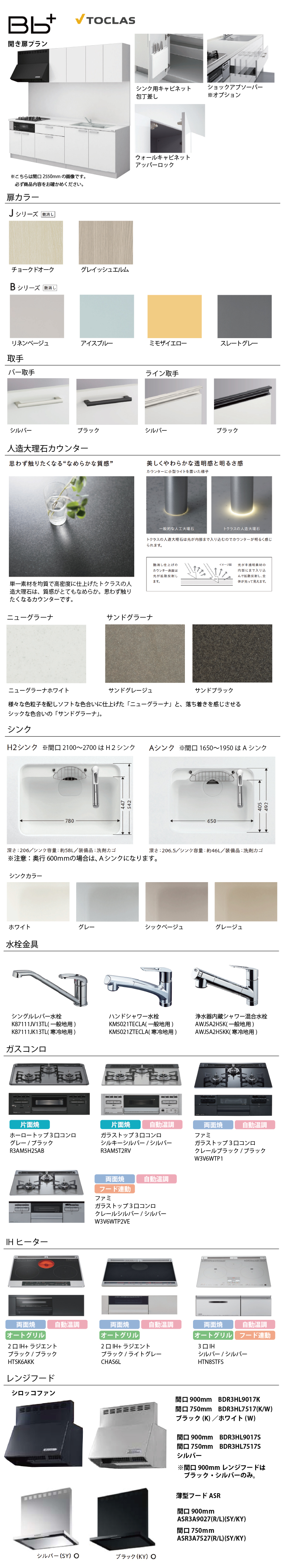 加熱機器無しをご選択の場合、加熱機器は現場支給とみなしまして穴あけ加工ありで手配いたします。水栓穴無しご希望の場合は「ストアへのご要望」欄に必ず「水栓穴無し希望」とご記入ください。また、壁出し水栓を設置される場合は奥行60cmを推奨致します。※定価、販売価格には、加熱機器・水栓の価格が含まれていない金額となりますのでご注意ください。※沖縄・離島配送不可■扉カラー ■Jシリーズ艶消しチョークドオークグレイッシュエルム ■Bシリーズ艶消しリネンベージュアイスブルーミモザイエロースレートグレー■シンクH2シンク■シンクカラーホワイト/グレー/シックベージュ/グレージュ■取手 ■バー取手シルバー/ブラック ■ライン取手シルバー/ブラック■人造大理石カウンター ニューグラーナホワイト/サンドグレージュ/サンドブラック■ウォールスペースアッパーロック付■水栓金具・シングルレバー水栓[一般地/寒冷地用] K87111J(V/K)13TL・ハンドシャワー水栓[一般地/寒冷地用] KM5021(Z)TECLA・浄水器内蔵シャワー混合水栓[一般地/寒冷地用] AWJSA2HSK(K)■加熱機器・ホーロートップ3口コンロ(グレー/ブラック)R3AM5H2SAB・ガラストップ3口コンロ(シルキーシルバー/シルバー)R3AM5T2RV・ファミガラストップ 3口コンロ(クレールシルバー/シルバー)W3V6WTP2VE・ファミ ガラストップ3口コンロ(クレールブラック/ブラック)W3V6WTP1・2口IH+ラジエント(ブラック/ライトグレー)CHAS6L・2口IH+ラジエント(ブラック/ブラック)HTSK6AKK・3口IH(シルバー/シルバー)HTN8STFS■レンジフード 間口900mm・シロッコファン(ブラック・シルバー)・薄型フードADR(シルバー)・薄型フードASR(ブラック/シルバー)■レールショックアブソーバーなし/ショックアブソーバーあり