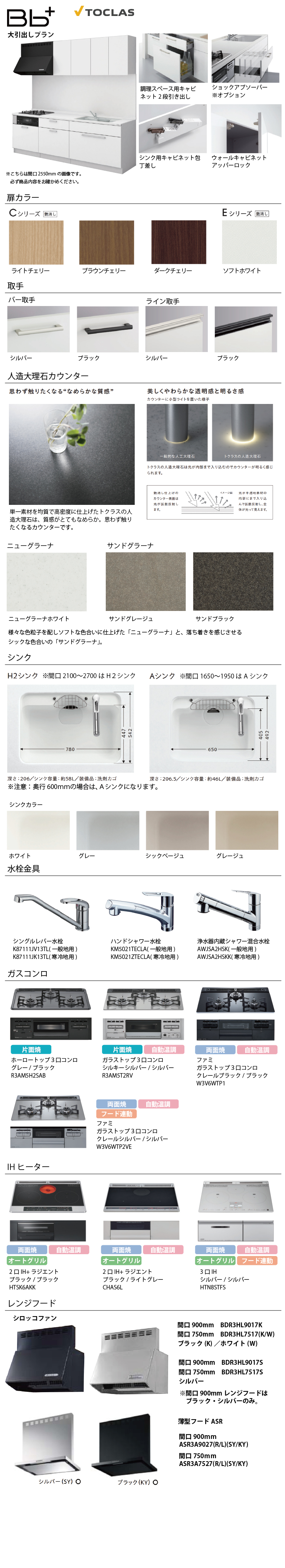 加熱機器無しをご選択の場合、加熱機器は現場支給とみなしまして穴あけ加工ありで手配いたします。水栓穴無しご希望の場合は「ストアへのご要望」欄に必ず「水栓穴無し希望」とご記入ください。また、壁出し水栓を設置される場合は奥行60cmを推奨致します。※定価、販売価格には、加熱機器・水栓の価格が含まれていない金額となりますのでご注意ください。※沖縄・離島配送不可■扉カラー ■Cシリーズ艶消しライトチェリーブラウンチェリーダークチェリー ■Eシリーズ艶消しソフトホワイト■シンクH2シンク■シンクカラーホワイト/グレー/シックベージュ/グレージュ■取手 ■バー取手シルバー/ブラック■人造大理石カウンター ニューグラーナホワイト/サンドグレージュ/サンドブラック■ウォールスペースアッパーロック付■水栓金具・シングルレバー水栓[一般地/寒冷地用] K87111J(V/K)13TL・ハンドシャワー水栓[一般地/寒冷地用] KM5021(Z)TECLA・浄水器内蔵シャワー混合水栓[一般地/寒冷地用] AWJSA2HSK(K)■加熱機器・ホーロートップ3口コンロ(グレー/ブラック)R3AM5H2SAB・ガラストップ3口コンロ(シルキーシルバー/シルバー)R3AM5T2RV・ファミガラストップ 3口コンロ(クレールシルバー/シルバー)W3V6WTP2VE・ファミ ガラストップ3口コンロ(クレールブラック/ブラック)W3V6WTP1・2口IH+ラジエント(ブラック/ライトグレー)CHAS6L・2口IH+ラジエント(ブラック/ブラック)HTSK6AKK・3口IH(シルバー/シルバー)HTN8STFS■レンジフード 間口900mm・シロッコファン(ブラック・シルバー)・薄型フードADR(シルバー)・薄型フードASR(ブラック/シルバー)■レールショックアブソーバーなし/ショックアブソーバーあり