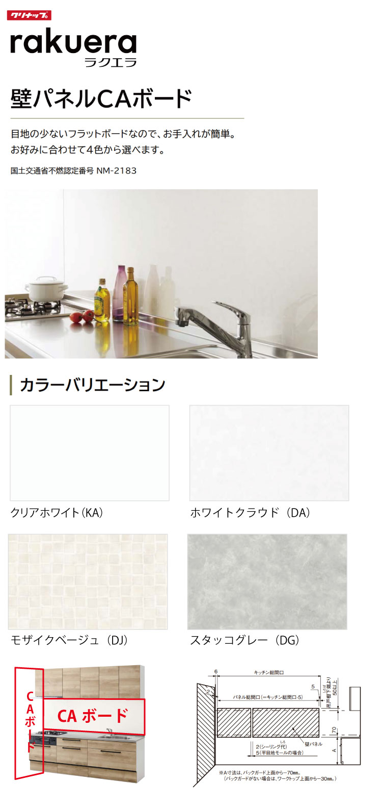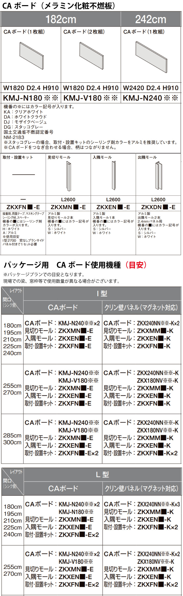 CAボードの枚数、見切りモール、入隅モール、出隅モール、取付・設置キット等につきましては、恐れ入りますがお客様ご自身にて必要数量をご確認のうえ、ご購入いただきますようお願いいたします。【CAボード(メラミン化粧不燃板)】■間口182cm・CAボード(1枚組)寸法:W1820×D2.4×H910mm品名:KMJ-N180※※ ・CAボード(2枚組)寸法:W1820×D2.4×H910mm品名:KMJ-V180※※ ■間口242cm・CAボード(1枚組)寸法:W2420×D2.4×H910mm機番の※にはカラー記号が入ります。KA:クリアホワイトDA:ホワイトクラウドDJ:モザイクベージュDG:スタッコグレー国土交通省不燃認定番号:NM-2183※スタッコグレーの場合、取付・設置キットのシーリング剤カラーをアルミを推奨しています。※CAボードをつなぎ合わせる場合、柄はつながりません。 ■取付・設置キットZKXFN■-E接着剤、両面テープ、マスキングテープシーリング材、スペーサー機番の■にはシーリング剤カラーが入ります。H:ホワイトA:アルミ※使用目安I型2700 窓なしプランサイドパネル付きで1セット必要 ■見切りモール寸法:L2600ZKXMN■-Eアルミ製見切りモール2本機番の■にはカラー記号が入ります。S:シルバーW:ホワイト ■入隅モール寸法:L2600ZKXEN■-Eアルミ製入隅モール1本機番の■にはカラー記号が入ります。S:シルバーW:ホワイト ■出隅モール寸法:L2600ZKXDN■-Eアルミ製出隅モール2本2.4mmパネル用機番の■にはカラー記号が入ります。S:シルバーW:ホワイト