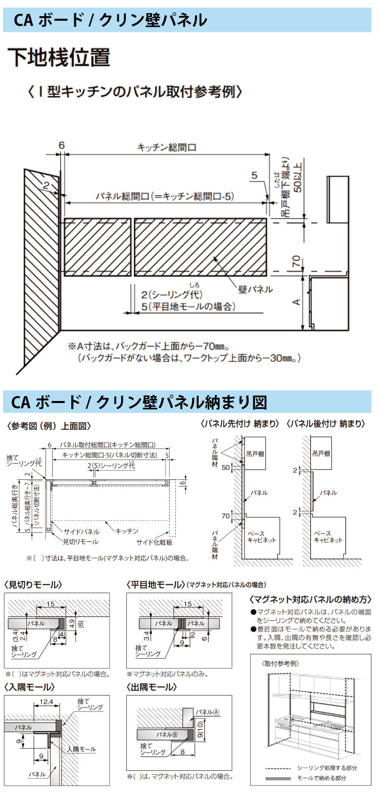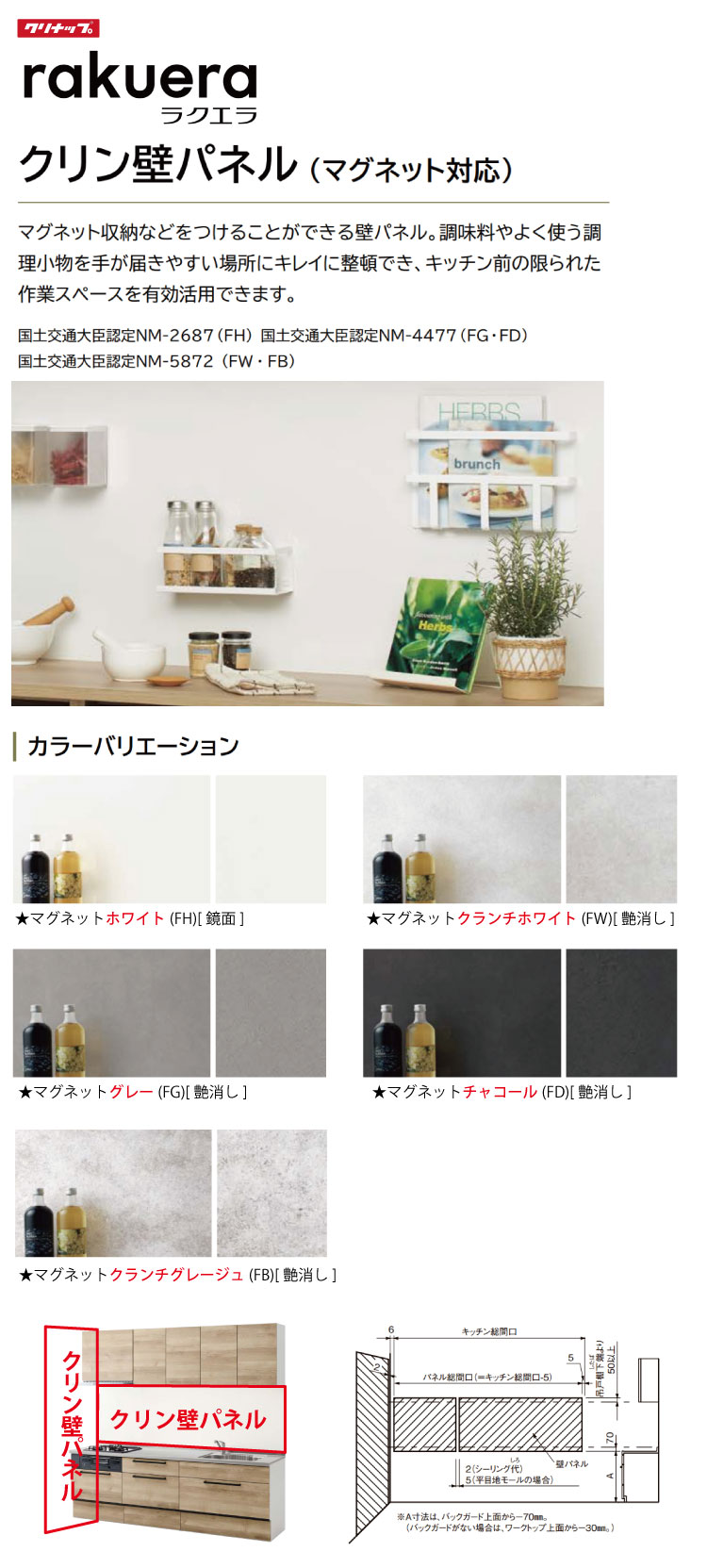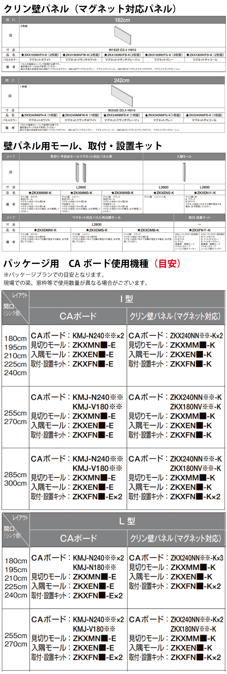 クリ壁パネルの枚数、見切りモール、入隅モール、出隅モール、取付・設置キット等につきましては、恐れ入りますがお客様ご自身にて必要数量をご確認のうえ、ご購入いただきますようお願いいたします。【クリン壁パネル(マグネット対応パネル)】 ・間口182cm2枚組寸法:W1820×D3.4×H910mm[パネルカラー] ★ZKX180NVFH-K:マグネットホワイト★ZKX180NVFW-K:マグネットクランチホワイト★ZKX180NVFB-K:マグネットクランチグレージュ★ZKX180NVFG-K:マグネットグレー★ZKX180NVFD-K:マグネットチャコール パネルの端面はシーリング処理が必要です。意匠面はモールを必ず使用してください。国土交通大臣認定NM-2687(マグネットホワイト)、NM-4477(マグネットグレー、マグネットチャコール)、NM-5872(マグネットクランチホワイト、マグネットクランチグレージュ) ・間口242cm1枚組寸法:W2420×D3.4×H910mm[パネルカラー] ★ZKX240NNFH-K:マグネットホワイト★ZKX240NNFW-K:マグネットクランチホワイト★ZKX240NNFB-K:マグネットクランチグレージュ★ZKX240NNFG-K:マグネットグレー★ZKX240NNFD-K:マグネットチャコール パネルの端面はシーリング処理が必要です。意匠面はモールを必ず使用してください。国土交通大臣認定NM-2687(マグネットホワイト)、NM-4477(マグネットグレー、マグネットチャコール)、NM-5872(マグネットクランチホワイト、マグネットクランチグレージュ) 【壁パネル用モール、取付・設置キット】 ■見切り・平目地モールマグネット対応パネル用 寸法:L2600 ★ZKXMMW-K ・アルミ製 ホワイト・見切りモール:マグネット対応パネル用2本・平目地モール:マグネット対応パネル用1本マグネット対応パネルの場合、必ず使用してください。 ★ZKXMMS-K ・アルミ製 シルバー・見切りモール:マグネット対応パネル用2本・平目地モール:マグネット対応パネル用1本マグネット対応パネルの場合、必ず使用してください。 ★ZKXMMB-K ・アルミ製 ブラック・見切りモール:マグネット対応パネル用2本・平目地モール:マグネット対応パネル用1本マグネット対応パネルの場合、必ず使用してください。 ■入隅モール 寸法:L2600 ★ZKXENS-Kアルミ製 シルバー1本 ★ZKXEN※-Kアルミ製1本B:ブラックW:ホワイトマグネット対応パネルで入隅が発生する場合、必ず使用してください。 ■マグネット対応パネル用出隅モール寸法:L2600 ★ZKXDMW-Kアルミ製 ホワイトマグネット対応パネル用2本マグネット対応パネルで出隅が発生する場合、必ず使用してください。 ★ZKXDMS-Kアルミ製 シルバーマグネット対応パネル用2本マグネット対応パネルで出隅が発生する場合、必ず使用してください。 ★ZKXDMB-Kアルミ製 ブラックマグネット対応パネル用2本マグネット対応パネルで出隅が発生する場合、必ず使用してください。 ■取付・設置キット ★ZKXFN※-K※はシーリングカラー記号表すB:ブラックH:ホワイトA:アルミ接着剤 両面テープマスキングテープシーリング剤スペーサー ★ZKXFN※-K※はシーリングカラー記号表すW:マットホワイトG:マットミドルグレーK:マットダークグレー接着剤 両面テープマスキングテープシーリング剤スペーサー