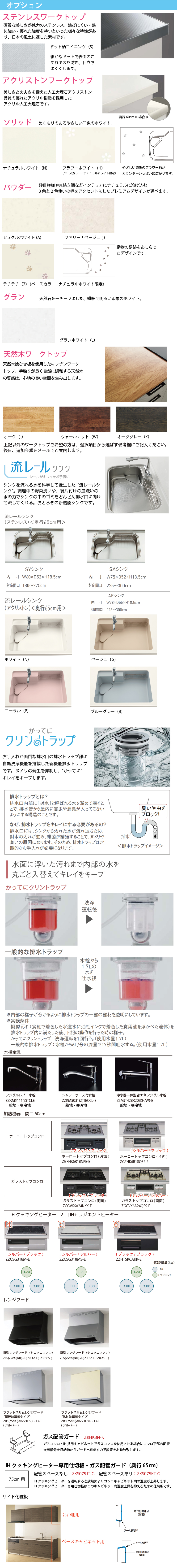 加熱機器無しをご選択の場合、加熱機器は現場支給とみなしまして穴あけ加工ありで手配いたします。 万が一穴無しでのご手配をご希望の場合は「ストアへのご要望」欄に必ず「加熱機器穴無し希望」とご記入ください。 ※定価、販売価格には、加熱機器・レンジフード・水栓の価格が含まれていない金額となりますのでご注意ください。選択項目からご希望の商品をお選びください。【扉カラー】 Class1 オーク[AVC]/ウォールナット[AVY]/オークグレー[AVG] 対応取手:V【シンク】 ■流レールシンク ステンレス(SY) 内 寸:W60×D52×H18.5cm対応間口:180〜225cm【かってにクリントラップ】お手入れが面倒な排水口の排水トラップ部に自動洗浄機能を搭載した新機能排水トラップです。ヌメリの発生を抑制し、かってにキレイをキープします。【ワークトップ】 ■ステンレスワークトップドット柄コイニング[S] ■アクリストンワークトップ・ソリッドナチュラルホワイト[N]フラワーホワイト[H][ベースカラー:ナチュラルホワイト限定]・パウダーシュクルホワイト[A]/ファリーナベージュ[I]・グラングランホワイト[L] ■天然木ワークトップオーク[J]/ウォールナット[W]/オークグレー[K] 【追加オプション】 ■水栓金具シングルレバー水栓/ZZKM5111(Z)TCLEシャワーホース付水栓/ZZKM5031(Z)TECCL-E浄水器一体型 省エネシングル水栓/ZSMJT428R20B(H/W)-E ■調理機器 ガスコンロ/IHホーロートップコンロ(水無片面焼き)/ZGFNK6R18NKE-E(ブラック/ブラック)ホーロートップコンロ(水無片面焼き)/ZGFNK6R18QSE-E(シルバー/ブラック)ガラストップコンロ(水無両面焼き)/ZGGVK6A24NKK-E(ブラック/ブラック)ガラストップコンロ(水無両面焼き)/ZGGVK6A24QSS-E(シルバー/シルバー)2口IH+ラジエントヒーター(水無両面焼き)/ZZCSG318M-E(シルバー/ブラック)2口IH+ラジエントヒーター(水無両面焼き)/ZZCSG318MS-E(シルバー/シルバー)2口IH+ラジエントヒーター(水無両面焼き)/ZZHTSK6AKK-E(ブラック/ブラック) ■レンジフード・深型レンジフード(シロッコファン)ZRS90NB(C/D)20FKZ-E(ブラック)/ZRS90NB(C/D)20FSZ-E(シルバー)・フラットスリムレンジフードZRS90ABZ21FS(R/L)-E(シルバー)/ZRS90ABZ21FC(R/L)-E(メタルブラック)【部材】■ガス配管ガード:ZKHKBN-K■IHクッキングヒーター専用仕切板(グリル付専用)75cm用・配管スペースなし:ZKS075JT-G・配管スペースあり:ZKS075KT-G 【サイド化粧板】■吊戸棚用:CHNE039(SW/PW/MW)BN-□□□■ベースキャビネット用 65cm用:CHNE067HBNN-□□□CH※1 ボーテシルバー(CJV)はステンレス調の化粧板になります。(ヨコ目柄)※2 class1(AV※)、class3(CH※)、class4(C3※、CW※)扉はヨコ目となります。ボーテシルバー(CJV)はステンレス調の化粧板になります。