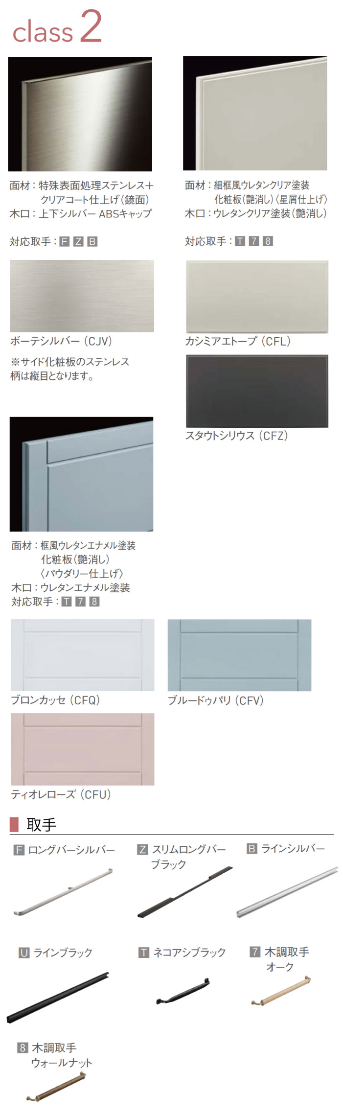 加熱機器無しをご選択の場合、加熱機器は現場支給とみなしまして穴あけ加工ありで手配いたします。 万が一穴無しでのご手配をご希望の場合は「ストアへのご要望」欄に必ず「加熱機器穴無し希望」とご記入ください。 ※定価、販売価格には、加熱機器・レンジフード・水栓の価格が含まれていない金額となりますのでご注意ください。選択項目からご希望の商品をお選びください。【扉カラー】 Class2 ・カシミアエトープ[CFL]/スタウトシリウス[CFZ] 対応取手:T78 ・ボーテシルバー[CJV] 対応取手:FZB ・ブロンカッセ[CFQ]/ブルードゥパリ[CFV]/ティオレローズ[CFU] 対応取手:T78【シンク】 ■流レールシンク ステンレス(SY) 内 寸:W60×D52×H18.5cm対応間口:180〜225cm【かってにクリントラップ】お手入れが面倒な排水口の排水トラップ部に自動洗浄機能を搭載した新機能排水トラップです。ヌメリの発生を抑制し、かってにキレイをキープします。【ワークトップ】 ■ステンレスワークトップドット柄コイニング[S] ■アクリストンワークトップ・ソリッドナチュラルホワイト[N]フラワーホワイト[H][ベースカラー:ナチュラルホワイト限定]・パウダーシュクルホワイト[A]/ファリーナベージュ[I]・グラングランホワイト[L] ■天然木ワークトップオーク[J]/ウォールナット[W]/オークグレー[K] 【追加オプション】 ■水栓金具シングルレバー水栓/ZZKM5111(Z)TCLEシャワーホース付水栓/ZZKM5031(Z)TECCL-E浄水器一体型 省エネシングル水栓/ZSMJT428R20B(H/W)-E ■調理機器 ガスコンロ/IHホーロートップコンロ(水無片面焼き)/ZGFNK6R18NKE-E(ブラック/ブラック)ホーロートップコンロ(水無片面焼き)/ZGFNK6R18QSE-E(シルバー/ブラック)ガラストップコンロ(水無両面焼き)/ZGGVK6A24NKK-E(ブラック/ブラック)ガラストップコンロ(水無両面焼き)/ZGGVK6A24QSS-E(シルバー/シルバー)2口IH+ラジエントヒーター(水無両面焼き)/ZZCSG318M-E(シルバー/ブラック)2口IH+ラジエントヒーター(水無両面焼き)/ZZCSG318MS-E(シルバー/シルバー)2口IH+ラジエントヒーター(水無両面焼き)/ZZHTSK6AKK-E(ブラック/ブラック) ■レンジフード・深型レンジフード(シロッコファン)ZRS90NB(C/D)20FKZ-E(ブラック)/ZRS90NB(C/D)20FSZ-E(シルバー)・フラットスリムレンジフードZRS90ABZ21FS(R/L)-E(シルバー)/ZRS90ABZ21FC(R/L)-E(メタルブラック)【部材】■ガス配管ガード:ZKHKBN-K■IHクッキングヒーター専用仕切板(グリル付専用)75cm用・配管スペースなし:ZKS075JT-G・配管スペースあり:ZKS075KT-G 【サイド化粧板】■吊戸棚用:CHNE039(SW/PW/MW)BN-□□□■ベースキャビネット用 65cm用:CHNE067HBNN-□□□CH※1 ボーテシルバー(CJV)はステンレス調の化粧板になります。(ヨコ目柄)※2 class1(AV※)、class3(CH※)、class4(C3※、CW※)扉はヨコ目となります。ボーテシルバー(CJV)はステンレス調の化粧板になります。