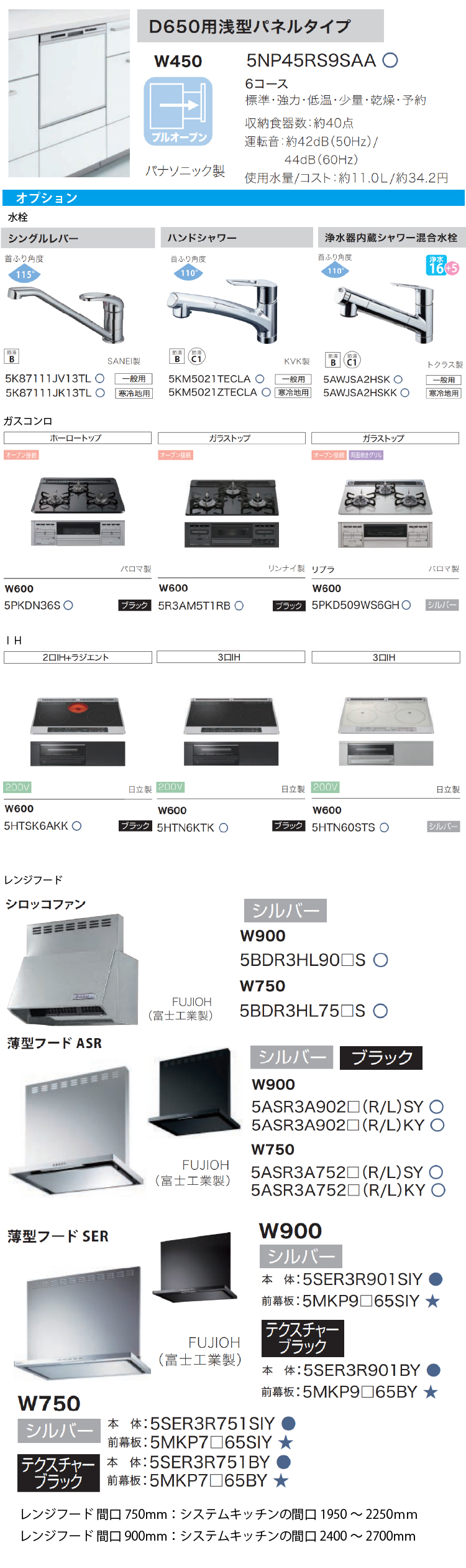 ■プラン仕様●カウンター:標準 ニューグラーナ●シンク:スムースワークシンク、フォールディングプレート、フォールディングラック●シンク用キャビネット:ステップドロワー付フロアスライド●コンロ用キャビネット:フロアスライド、スタンドディバイダー、ナベフタホルダー●調理スペース用キャビネット:フロアスライド、ディバイダーセット●ウォールキャビネット:ミドルウォール(H700)■扉グレード6・ハイグレイン※約3週間以上: 紅殻/べんがら/墨染/すみぞめ■取手ロングバー取手:シルバー/ブラックソリッド取手:シルバー/ブラックライン取手シルバー/ブラックスリムバー取手:サテンニッケル■カウンター[グレード1]ニューグラーナ:ニューグラーナホワイト、ニューグラーナファインベージュ[グレード2]サンドグラーナ:サンドブラック、サンドグレージュ[グレード3]グラーナ2:マーブルホワイト、ピュアホワイト[グレード4]ハイグラーナ:ハイグラーナホワイト、ハイグラーナブラックアートグラーナ:アートグラーナホワイト、アートグラーナベージュ■水栓シングルレバー:5K87111JK13TL(一般用) / 5K87111JV13TL(寒冷地用)ハンドシャワー:5KM5021TECLA(一般用) / 5KM5021ZTECLA(寒冷地用)浄水器内蔵シャワー混合水栓:5AWJSA2HSKK(一般用) / 5AWJSA2HSK(寒冷地用)■加熱機器ガスコンロ ホーロートップ:5PKDN36S(ブラック)ガスコンロ ガラストップ:5R3AM5T1RB(ブラック)ガスコンロ ガラストップ:5R3AM5T2RV(シルバー)IH 2口IH+ラジエント:5HTSK6AKK(ブラック)IH 3口IH:5HTN6KTK(ブラック)IH 3口IH:5HTN60STS(ブラック)■レンジフード 間口900mmシロッコファン:5BDR3HL9017S(シルバー)薄型フードASR:5ASR3A902□(R/L)SY(シルバー)薄型フードASR:5ASR3A902□(R/L)KY(ブラック)薄型フードSER:5SER3R901SIY(シルバー)■食洗機:浅型パネルタイプ(5NP45RS9SAA)