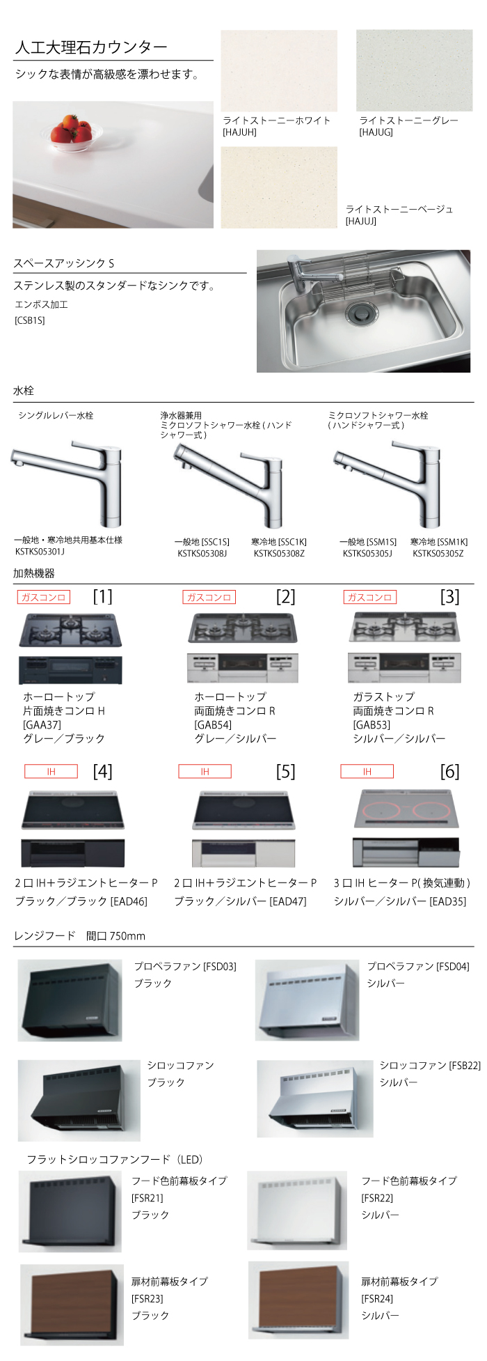 加熱機器無しをご選択の場合、加熱機器は現場支給とみなしまして穴あけ加工ありで手配いたします。 万が一穴無しでのご手配をご希望の場合は「ストアへのご要望」欄に必ず「加熱機器穴無し希望」とご記入ください。 また、水栓穴無しご希望の場合も「水栓穴無し希望」とご記入ください。 ※定価、販売価格には、加熱機器・レンジフード・水栓の価格が含まれていない金額となりますのでご注意ください。 選択項目からご希望の商品をお選びください。また、システム上、販売価格にお選び頂いた商品の金額が加算されませんので、 後日、メールにて金額をご案内致します。 プライスグループ1 ■扉カラー ホワイト[1JA]グレー[1JB]ネイビーブルー[1JD]アカシアベージュ[1J1]アカシアキャラメル[1J2]アカシアブラウン[1J3] ■取手ラウンド取っ手(ステンシルバー)[KA]ラウンド取っ手(ブラック)[KE]ライン取っ手[MF] ■シンクスペースアップシンク(ラクピカコート無し)スペースアップシンク(エンボス加工)[CSA1S]ステンレスすべり台シンク[CSF0S] ステンレスすべり台シンク(エンボス加工)[CSF1S]すべり台シンクホワイト[CSEPH]/ベージュN[CSEPM]/ライトピンク[CSEPD]/グレー[CSEPG]/ペールグリーン[CSEPF] ※間口1800・1950mmは、スペースアップシンクS(ラクピカコート無し) ■カウンターステンレスカウンター(銀河エンボス仕上げ)ライトストーニーホワイト[HAJUH]ライトストーニーグレー[HAJUG]ライトストーニーベージュ[HAJUJ] 【追加オプション】 ■水栓 シングルレバー水栓ミクロソフトシャワー水栓(ハンドシャワー式)浄水器兼用 ミクロソフトシャワー水栓(ハンドシャワー式) ■レンジフード プロペラファン(ブラック・シルバー)シロッコファン(ブラック・シルバー)フラットシロッコファンフード(シルバー・ブラック) ※フード色前幕板・扉材前幕板※間口1800・1950mmは、レンジフード幅750mmです。※間口2100〜3000は、レンジフード幅900mmです。 ■加熱機器 ホーロートップ片面焼きコンロH(グレー/ブラック)[GAA37]ホーロートップ 両面焼きコンロR(グレー/シルバー)[GAB54]ガラストップ 両面焼きコンロR(シルバー/シルバー)[GAB53]2口IH+ラジエントヒーターP(ブラック/ブラック)[EAD46]2口IH+ラジエントヒーターP(ブラック/シルバー)[EAD47]3口IHヒーターP(シルバー/シルバー)[EAD35]