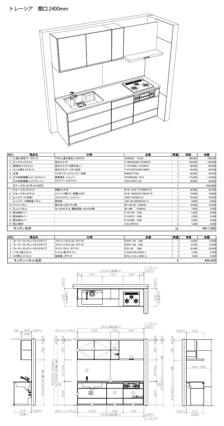 Treasia トレーシア【仕様】 奥行:65cm キッチン本体サイズ:I型240cm 天板高さ:85p 扉カラー:ホワイト・シルバーモール キッチンパネル:Pタイプ/ホワイト 引手タイプ:レール引手タイプ ワークトップ材質:アクリル人造大理石 ソリッドホワイト シンク:アクリル人造大理石シンク(ホワイト) 水栓:エコタイプハンドシャワー水栓(KM5021TTKE) 食器洗い乾燥機:なし 加熱機器:60pハイパーガラスコート 両面焼き・シルバー 3口コンロ(TN72WV60C) ガス加熱機器(トッププレート):クリアパールホワイト(TN72-60TP-CH) レンジ機器:なし ガス種:13A 周波数:60Hz ウォールキャビネット:耐震ラッチ付 レンジフード:シロッコファン シルバー色 VRAT-903ADL(V) ホーローキッチンパネルPタイプ