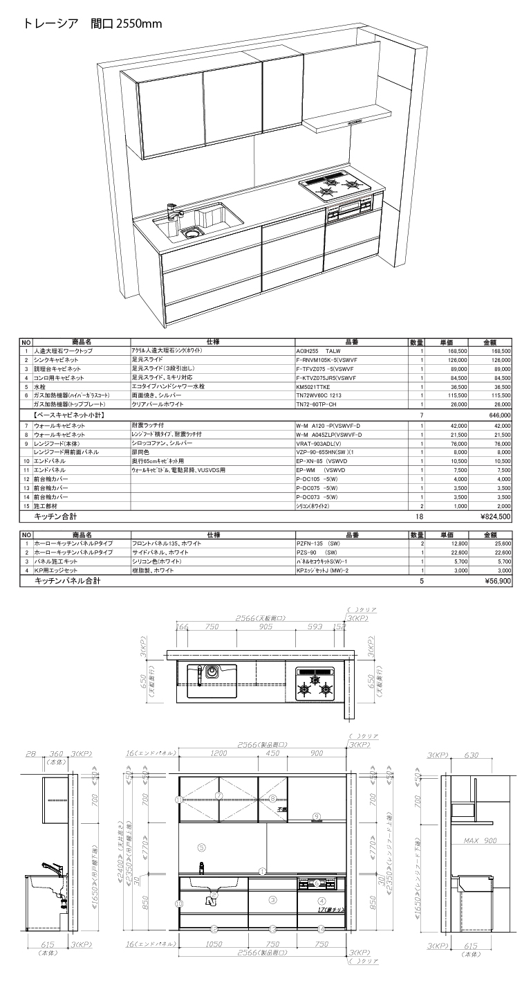 Treasia トレーシア【仕様】 奥行:65cm キッチン本体サイズ:I型255cm 天板高さ:85p 扉カラー:ホワイト・シルバーモール キッチンパネル:Pタイプ/ホワイト 引手タイプ:レール引手タイプ ワークトップ材質:アクリル人造大理石 ソリッドホワイト シンク:アクリル人造大理石シンク(ホワイト) 水栓:エコタイプハンドシャワー水栓(KM5021TTKE) 食器洗い乾燥機:なし 加熱機器:60pハイパーガラスコート 両面焼き・シルバー 3口コンロ(TN72WV60C) ガス加熱機器(トッププレート):クリアパールホワイト(TN72-60TP-CH) レンジ機器:なし ガス種:13A 周波数:60Hz ウォールキャビネット:耐震ラッチ付 レンジフード:シロッコファン シルバー色 VRAT-903ADL(V) ホーローキッチンパネルPタイプ