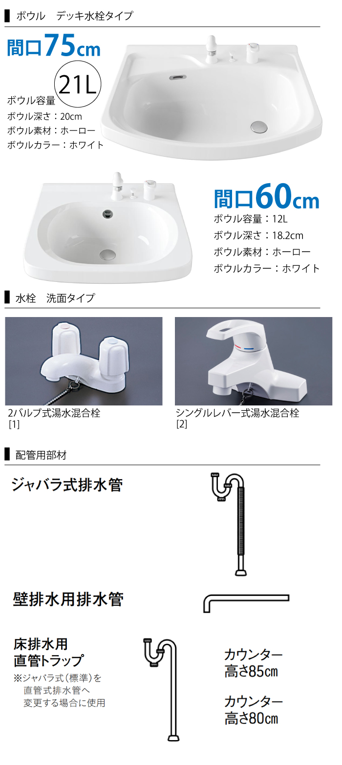 ■扉カラー・グループ1ウッディーミディアム[UEU] / ウッディーホワイト[UEW]・グループ2ブラウン[USB] / ライトグレー[USF] / ベージュ[UST] / ピュアピンク[USP] / ホワイト[USW]■カウンター・デッキ水栓タイプ■ボウルホーローボウル:ホワイト■下台タイプ・扉タイプ:洗面タイプ S-UBDN060HXA(□)LA-1排水口:フランジあり / 排水栓:ゴム式※扉タイプはゴム栓仕様となります。■配管用部材ジャバラ式排水管壁排水用排水管:PカンA(N)床排水用直管トラップ:SチョッカントラップA(N)■水栓[1]2バルブ式湯水混合栓:TKM66A[2]シングルレバー式湯水混合栓(ホワイト):TKM7014※寒冷地仕様の場合、品番末尾にCが付きます。 ■ミラー・2面鏡LED:5W / コンセント:内側1口・外側1口SIM-060M2AHYEA-2:くもり止めコーティング(左側ミラー)SIM-060M2AHNEA-2:くもり止めなしミラーパネル(樹脂製):PSJ-60A-1ホーロー製:PSM-60(SW)・1面鏡(鏡裏収納付)LED:5W / コンセント:内側1口・外側1口SIM-060M1AHYEA-2:くもり止めコーティングSIM-060M1AHNEA-2:くもり止めなしミラーパネル(樹脂製):PSJ-60A-1ホーロー製:PSM-60(SW)・1面鏡(収納棚付)LED:5W / コンセント:1口SHM-060M1NFYEA-1:くもり止めコーティングSHM-060M1NFNEA-1:くもり止めなし※専用オプション(ラック、フック)をオープン棚に取り付け可能(別途販売)■ショートミラー・2面鏡LED:5W / コンセント:内側1口・外側1口SIM-060M2AHYEA-2:くもり止めコーティング(左側ミラー)SIM-060M2AHNEA-2:くもり止めなしミラーパネル(樹脂製):PSJ-60SA-1・1面鏡(鏡裏収納付)LED:5W / コンセント:内側1口・外側1口SIM-060M1AHYEA-2:くもり止めコーティングSIM-060M1AHNEA-2:くもり止めなしミラーパネル(樹脂製):PSJ-60SA-1・1面鏡(収納棚付)LED:5W / コンセント1口※専用オプション(ラック、フック)をオープン棚に取り付け可能(別途販売)