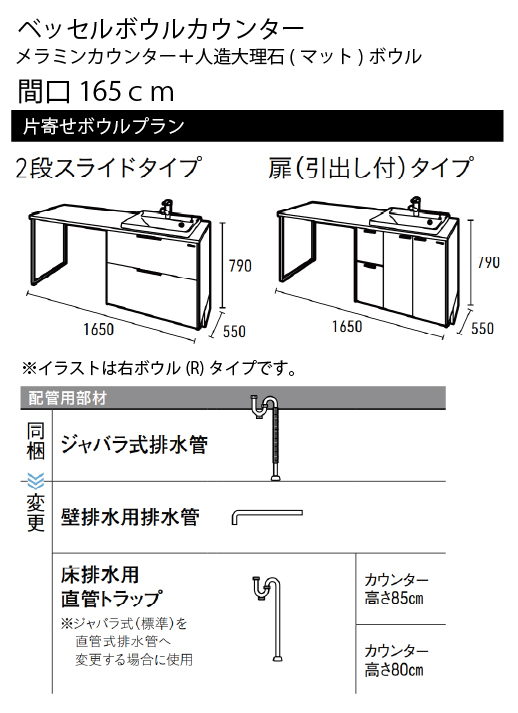 洗面化粧台 ファミーユ ベッセルボウルカウンター タカラスタンダード [familebe165plan] 間口165cm 片寄せボウルプラン メーカー直送