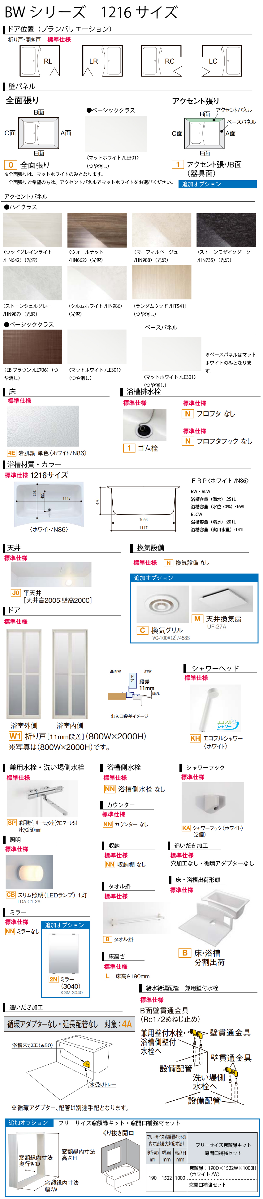 [シリーズ・タイプ・ドア位置 ] BWシリーズ 1216サイズ 地域区分:一般地[H] / 寒冷地[C] ドア位置:RL / LR / RC / LC [壁プラン(全面張り)]・ベーシッククラスマットホワイト[LE301] ※全面張りは、マットホワイトのみとなります。 【追加オプション】 [アクセント張りB面(器具面) ]●アクセントパネル・ハイクラスウッドグレインライト/HN642(光沢)ウォールナット/HN662(光沢)マーフィルベージュ/HN988(光沢)ストーンモザイクダーク/HN735(光沢)ストーンシェルグレー/HN987(光沢)クルムホワイト/HN986(光沢)ランダムウッド/HT541(つや消し) ・ベーシッククラスEBブラウン/LE706(つや消し)マットホワイト/LE301(つや消し) ●ペースパネル・ベーシッククラスマットホワイト/LE301 [床・浴槽 ] 床:岩肌調 単色(ホワイト N86)[4E] 浴槽材質・カラー:FRP(ホワイト N86)[Q] 浴槽排水栓:ゴム栓[1] フロフタ:なし[N] フロフタフック:なし[N] [天井・換気設備 ] 天井:平天井(天井高2005:壁高2000)[J0] 換気設備:なし[N] / 【追加オプション】換気グリル[C] / 【追加オプション】天井換気扇[M] [ドア ] 折り戸:11mm段差 800W×2000H[W1] 有効幅員(mm)650 [水栓・シャワー] 兼用水栓・洗い場側水栓:兼用ツーハンドルデッキ水栓[JK] 【追加オプション】兼用壁付サーモ水栓(クロマーレS)吐水250mm[SP]※1 ※1 給水給湯配管:兼用壁付水栓 B面壁貫通金具(RC1/2めねじ止め)[J] になります。カタログを参照ください。 浴槽側水栓:なし[NN] シャワーヘッド:エコフルシャワー(ホワイト)[KH] [シャワー・カウンター・洗面器・照明 ] シャワーフック:ホワイト2個[KA] カウンター:なし[NN] 照明:スリム照明(LEDランプ)[CB] [ミラー・収納・タオル掛 ] ミラー:[NN]なし / 【追加オプション】ミラー(3040)[2N] 収納棚:[NN]なし タオル掛:タオル掛[B] [床高さ・オプション ] 床・浴槽出荷形態:床・浴槽 分割出荷[B] 床高さ:床高さ190mm[L]/床高さ230mm[M] [追いだき加工]穴:なし 循環アダプター:なし【追加オプション】水受けトレー+浴槽穴加工のみ(循環アダプター現場手配) 延長配管なし [給水給湯配管]B面壁貫通金具(Rc1/2めねじ止め) 【追加オプション】 [フリーサイズ窓枠縁キット・窓開口補強材セット] 寸法:奥行190mm×1522mm×1000mm[F71] ※窓額縁1522W×1000Hは、1000W×1500Hとしても使用できます。