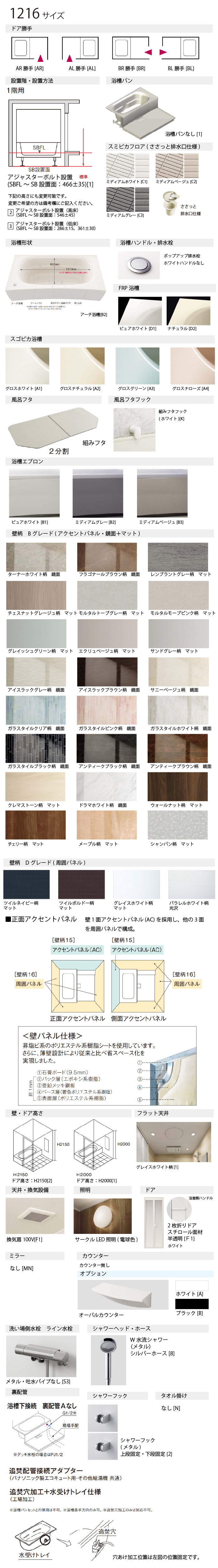 ■サイズ1216サイズ ■ドア勝手AR勝手[AR] AL勝手[AL] BR勝手[BR] BL勝手[BL] ■設置階・設置方法 1階用[1]アジャスターボルト設置(SBFL〜SB設置面:466プラスマイナス35)[1]アジャスターボルト設置(高床)(SBFL〜SB設置面:546プラスマイナス45)[2]アジャスターボルト設置(低床)(SBFL〜SB設置面:286プラスマイナス30)[3]※アジャスターボルト設置 1階用となっております。架台設置等も変更可能です。その際は、備考欄にご記入ください。 ■浴槽パン浴槽パンなし[1] ■スミピカフロア 単色(ささっと排水口仕様)ミディアムホワイト[C1]/ミディアムベージュ[C2]/ミディアムグレー[C3] ■床暖房床暖房なし[1] ■浴槽形状アーチ浴槽[B2] ■浴槽FRP浴槽:ピュアホワイト[D1]/ナチュラル[D2]スゴピカ浴槽:グロスホワイト[A1]/グロスナチュラル[A2]/グロスグリーン[A3]/グロスローズ[A4] ■保温浴槽2なし保温浴槽2なし[B1] ■浴槽ハンドル・排水栓ポップアップ排水栓 ホワイトハンドルなし[4] ■風呂フタ組みフタ[K2]/断熱組みフタ(2分割)[D2] ■風呂フタフック組みフタフック(ホワイト)[K] ■浴槽エプロンピュアホワイト[B1] ミディアムグレー[B2] ミディアムベージュ[B3] ■壁柄Bグレード(アクセントパネル・鏡面+マット) ■壁・ドア高さドア高さ:H2150[2] ドア高さ:H2000[1] ■天井フラット天井 グレイスホワイト柄[1] ■天井・換気設備換気扇100V[F1] ■天井開口仕様選択した換気設備の開口[FA] ■ドア2枚折りドア(スチロール面材 半透明)[F1] ■カウンターなし[N]オーバルカウンター:ホワイト[A]/ブラック[B] ■洗い場側水栓ライン水栓:ホワイト・吐水パイプなし[S1]/メタル・吐水パイプなし[S3]スゴピカ水栓(スクエア):ホワイト[P1]/ブラック[P2] ■シャワーヘッド・ホースメタル・シルバーホース[8] ■浴槽側水栓なし[N] ■照明サークルLED照明(電球色)[A1] ■ミラーなし[MN] ■収納棚なし[N] ■収納テーブルなし[N] ■スライドバーシャワーフック(メタル)[2] ■タオル掛けなし[N] ■裏配管浴槽下接続 裏配管Aなし[7]※必ず工事業者様とご相談ください。 ■断熱材(床)断熱材なし 気密パッキンなし[N] ■断熱材(壁・天井)なし[N] ■フリーサイズ窓枠なし1m×4本(ブラック・ホワイト)D=190mm/D=290mm/D=450mm