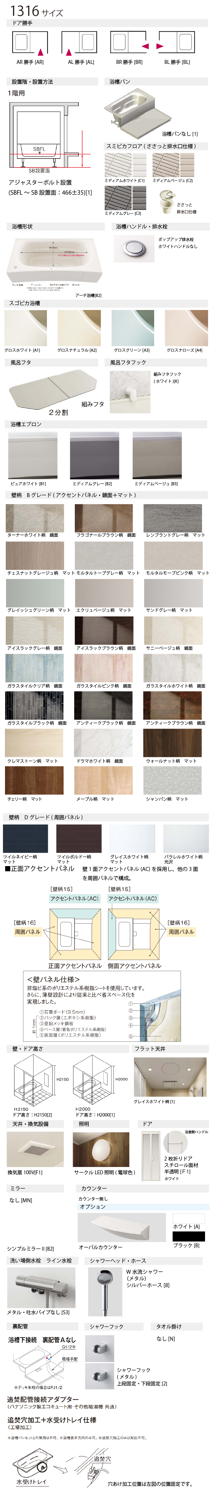 ■サイズ1316サイズ ■ドア勝手AR勝手[AR] AL勝手[AL] BR勝手[BR] BL勝手[BL] ■設置階・設置方法 1階用[1]アジャスターボルト設置(SBFL〜SB設置面:466プラスマイナス35)[1]アジャスターボルト設置(高床)(SBFL〜SB設置面:546プラスマイナス45)[2]アジャスターボルト設置(低床)(SBFL〜SB設置面:286プラスマイナス30)[3]※アジャスターボルト設置 1階用となっております。架台設置等も変更可能です。その際は、備考欄にご記入ください。 ■浴槽パン浴槽パンなし[1] ■スミピカフロア 単色(ささっと排水口仕様)ミディアムホワイト[C1]/ミディアムベージュ[C2]/ミディアムグレー[C3] ■床暖房床暖房なし[1] ■浴槽形状アーチ浴槽[B2] ■浴槽スゴピカ浴槽 グロスホワイト[A1] グロスナチュラル[A2] グロスローズ[A4] ■保温浴槽2なし保温浴槽2なし[B1] ■浴槽ハンドル・排水栓ポップアップ排水栓 ホワイトハンドルなし[4] ■風呂フタ組みフタ[K2]/断熱組みフタ(2分割)[D2] ■風呂フタフック組みフタフック(ホワイト)[K] ■浴槽エプロンピュアホワイト[B1] ミディアムグレー[B2] ミディアムベージュ[B3] ■壁柄Bグレード(アクセントパネル・鏡面+マット) ■壁・ドア高さドア高さ:H2150[2] ドア高さ:H2000[1] ■天井フラット天井 グレイスホワイト柄[1] ■天井・換気設備換気扇100V[F1] ■天井開口仕様選択した換気設備の開口[FA] ■ドア2枚折りドア(スチロール面材 半透明)[F1] ■カウンターなし[N]オーバルカウンター:ホワイト[A]/ブラック[B] ■洗い場側水栓ライン水栓:ホワイト・吐水パイプなし[S1]/メタル・吐水パイプなし[S3]スゴピカ水栓(スクエア):ホワイト[P1]/ブラック[P2] ■シャワーヘッド・ホースメタル・シルバーホース[8] ■浴槽側水栓なし[N] ■照明サークルLED照明(電球色)[A1] ■ミラーなし[MN] ■収納棚なし[N] ■収納テーブルなし[N] ■スライドバーシャワーフック(メタル)[2] ■タオル掛けなし[N] ■裏配管浴槽下接続 裏配管Aなし[7]※必ず工事業者様とご相談ください。 ■断熱材(床)断熱材なし 気密パッキンなし[N] ■断熱材(壁・天井)なし[N] ■フリーサイズ窓枠なし1m×4本(ブラック・ホワイト)D=190mm/D=290mm/D=450mm