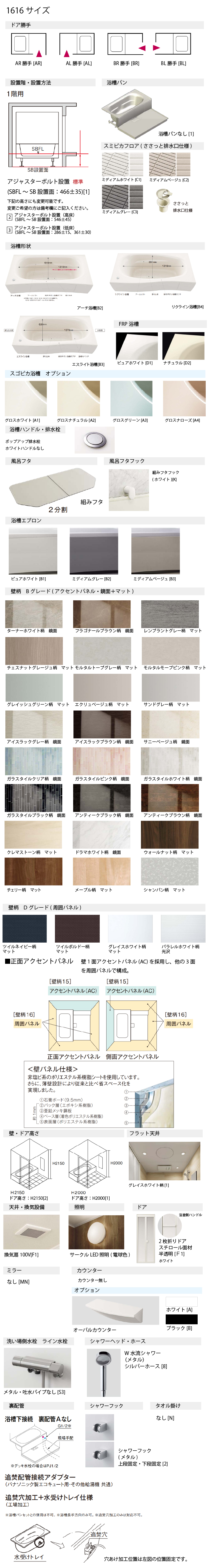 ■サイズ1616サイズ ■ドア勝手AR勝手[AR] AL勝手[AL] BR勝手[BR] BL勝手[BL] ■設置階・設置方法 1階用[1]アジャスターボルト設置(SBFL〜SB設置面:466プラスマイナス35)[1]アジャスターボルト設置(高床)(SBFL〜SB設置面:546プラスマイナス45)[2]アジャスターボルト設置(低床)(SBFL〜SB設置面:286プラスマイナス30)[3]※アジャスターボルト設置 1階用となっております。架台設置等も変更可能です。その際は、備考欄にご記入ください。 ■浴槽パン浴槽パンなし[1] ■スミピカフロア 単色(ささっと排水口仕様)ミディアムホワイト[C1]/ミディアムベージュ[C2]/ミディアムグレー[C3] ■床暖房床暖房なし[1] ■浴槽形状アーチ浴槽[B2]/エスライン浴槽[B3]/リクライン浴槽[B4] ※リクライン浴槽ですと、FRP浴槽の対応はございません。 スゴピカ浴槽からお選びください。ご希望の方は備考欄にご記入ください。 ■浴槽FRP浴槽:ピュアホワイト[D1]/ナチュラル[D2]スゴピカ浴槽:グロスホワイト[A1]/グロスナチュラル[A2]/グロスグリーン[A3]/グロスローズ[A4] ■保温浴槽2なし保温浴槽2なし[B1] ■浴槽ハンドル・排水栓ポップアップ排水栓 ホワイトハンドルなし[4] ■風呂フタ組みフタ[K2]/断熱組みフタ(2分割)[D2] ■風呂フタフック組みフタフック(ホワイト)[K] ■浴槽エプロンピュアホワイト[B1] ミディアムグレー[B2] ミディアムベージュ[B3] ■壁柄Bグレード(アクセントパネル・鏡面+マット) ■壁・ドア高さドア高さ:H2150[2] ドア高さ:H2000[1] ■天井フラット天井 グレイスホワイト柄[1] ■天井・換気設備換気扇100V[F1] ■天井開口仕様選択した換気設備の開口[FA] ■ドア2枚折りドア(スチロール面材 半透明)[F1] ■カウンターなし[N]オーバルカウンター:ホワイト[A]/ブラック[B] ■洗い場側水栓ライン水栓:ホワイト・吐水パイプなし[S1]/メタル・吐水パイプなし[S3]スゴピカ水栓(スクエア):ホワイト[P1]/ブラック[P2] ■シャワーヘッド・ホースメタル・シルバーホース[8] ■浴槽側水栓なし[N] ■照明サークルLED照明(電球色)[A1] ■ミラーなし[MN] ■収納棚なし[N] ■収納テーブルなし[N] ■スライドバーシャワーフック(メタル)[2] ■タオル掛けなし[N] ■裏配管浴槽下接続 裏配管Aなし[7]※必ず工事業者様とご相談ください。 ■断熱材(床)断熱材なし 気密パッキンなし[N] ■断熱材(壁・天井)なし[N] ■フリーサイズ窓枠なし1m×4本(ブラック・ホワイト)D=190mm/D=290mm/D=450mm