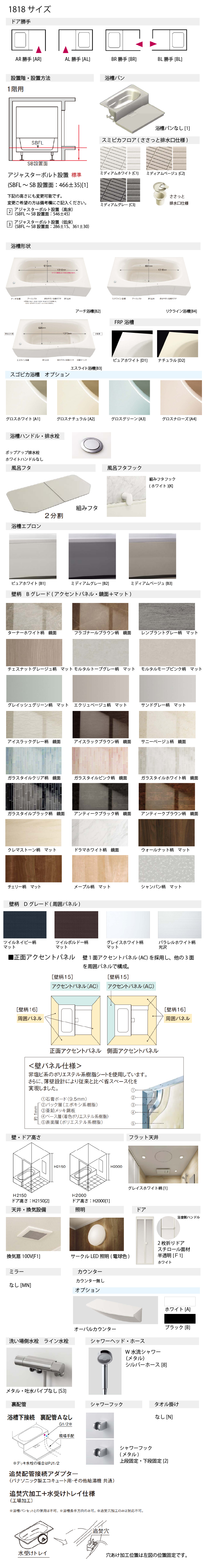 ■サイズ1818サイズ ■ドア勝手AR勝手[AR] AL勝手[AL] BR勝手[BR] BL勝手[BL] ■設置階・設置方法 1階用[1]アジャスターボルト設置(SBFL〜SB設置面:466プラスマイナス35)[1]アジャスターボルト設置(高床)(SBFL〜SB設置面:546プラスマイナス45)[2]アジャスターボルト設置(低床)(SBFL〜SB設置面:286プラスマイナス30)[3]※アジャスターボルト設置 1階用となっております。架台設置等も変更可能です。その際は、備考欄にご記入ください。 ■浴槽パン浴槽パンなし[1] ■スミピカフロア 単色(ささっと排水口仕様)ミディアムホワイト[C1]/ミディアムベージュ[C2]/ミディアムグレー[C3] ■床暖房床暖房なし[1] ■浴槽形状アーチ浴槽[B2]/エスライン浴槽[B3]/リクライン浴槽[B4] ※リクライン浴槽ですと、FRP浴槽の対応はございません。 スゴピカ浴槽からお選びください。ご希望の方は備考欄にご記入ください。 ■浴槽FRP浴槽:ピュアホワイト[D1]/ナチュラル[D2]スゴピカ浴槽:グロスホワイト[A1]/グロスナチュラル[A2]/グロスグリーン[A3]/グロスローズ[A4] ■保温浴槽2なし保温浴槽2なし[B1] ■浴槽ハンドル・排水栓ポップアップ排水栓 ホワイトハンドルなし[4] ■風呂フタ組みフタ[K2]/断熱組みフタ(2分割)[D2] ■風呂フタフック組みフタフック(ホワイト)[K] ■浴槽エプロンピュアホワイト[B1] ミディアムグレー[B2] ミディアムベージュ[B3] ■壁柄Bグレード(アクセントパネル・鏡面+マット) ■壁・ドア高さドア高さ:H2150[2] ドア高さ:H2000[1] ■天井フラット天井 グレイスホワイト柄[1] ■天井・換気設備換気扇100V[F1] ■天井開口仕様選択した換気設備の開口[FA] ■ドア2枚折りドア(スチロール面材 半透明)[F1] ■カウンターなし[N]オーバルカウンター:ホワイト[A]/ブラック[B] ■洗い場側水栓ライン水栓:ホワイト・吐水パイプなし[S1]/メタル・吐水パイプなし[S3]スゴピカ水栓(スクエア):ホワイト[P1]/ブラック[P2] ■シャワーヘッド・ホースメタル・シルバーホース[8] ■浴槽側水栓なし[N] ■照明サークルLED照明(電球色)[A2] ■ミラーなし[MN] ■収納棚なし[N] ■収納テーブルなし[N] ■スライドバーシャワーフック(メタル)[2] ■タオル掛けなし[N] ■裏配管浴槽下接続 裏配管Aなし[7]※必ず工事業者様とご相談ください。 ■断熱材(床)断熱材なし 気密パッキンなし[N] ■断熱材(壁・天井)なし[N] ■フリーサイズ窓枠なし1m×4本(ブラック・ホワイト)D=190mm/D=290mm/D=450mm