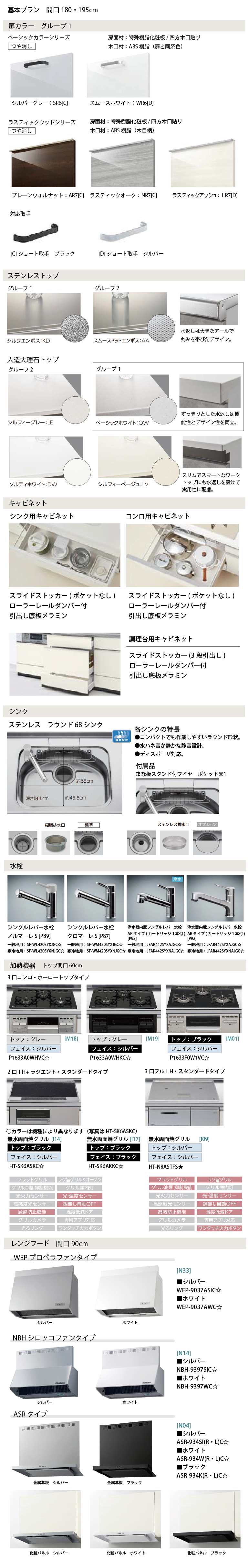 【扉グループ1】 ■ベーシックカラーシリーズ シルバーグレー:SR6[C]/スムースホワイト:WR6[D] ■ラスティックウッドシリーズ プレーンウォルナット:AR7[C]/ラスティックオーク:NR7[C]/ラスティックアッシュ:TR7[D]【ワークトップ】 ■ステンレストップ シルクエンボス/スムーズドットエンボス ■人造大理石トップ ベーシックホワイト/シルフィーグレー/シルフィーベージュ/ソルティホワイト【シンク】 ステンレス:ラウンド68シンク(樹脂排水口/ステンレス排水口)【水栓金具】■シングルレバー水栓 ノルマーレS[P89]一般地用:SF-WL420SYXJGC☆/寒冷地用:SF-WL420SYXNJGC☆■シングルレバー水栓 クロマーレS(シングルレバー)[P87]一般地用:SF-WM420SYXJGC☆/寒冷地用:SF-WM420SYXNJGC☆■浄水器内蔵シングルレバー水栓 ARタイプ(カートリッジ1本付)[P92]一般地用:JFAR442SYXAJGC☆/寒冷地用:JFAR442SYXNAJGC☆■ハンドシャワー水栓 クロマーレS(ハンドシャワー)一般地用:SFBE451SYXJG5★/寒冷地用:SFBE451SYXNJG5★【加熱機器】■3口コンロ・ホーロートップタイプ無水片面焼グリル(トップ:グレー/フェイス:シルバー)[M18]P1633A0WHVC☆■3口コンロ・ホーロートップタイプ 無水片面焼グリル(トップ:グレー/フェイス:ブラック)[M19]P1633A0WHKC☆■3口コンロ・ガラストップタイプ無水片面焼グリル(トップ:ブラック/フェイス:シルバー)[M01]R1633F0W1VC☆■2口TH+ラジエント・スタンダードタイプ無水両面焼グリル(トップ:ブラック/フェイス:シルバー)[I14]HT-SK6ASKC☆■2口TH+ラジエント・スタンダードタイプ無水両面焼グリル(トップ:ブラック/フェイス:ブラック)[I17]HT-SK6AKKC☆■3口フルTH・スタンダードタイプ3無水両面焼グリル(トップ:シルバー/フェイス:シルバー)[I09]HT-N8ASTFS★【レンジフード 間口90cm】■WEPプロペラファンタイプ[N33]シルバー:WEP-9037ASIC☆ホワイト:WEP-9037AWC☆■NBHシロッコファンタイプ[N14]シルバー:NBH-9397SIC☆ホワイト:NBH-9397WC☆■ASRタイプ[N04]シルバー:ASR-934SI(R/L)C☆ホワイト:ASR-934W(R/L)C☆ブラック:ASR-934K(R/L)C☆【レンジフード 横幕板】■WEPプロペラファンタイプシルバー/ホワイト:WPMC3-32510(SI・W)C☆■NBHシロッコファンタイプシルバー/ホワイト:RSP-A-300D(SI・W)C☆■ASRタイプシルバー/ホワイト/ブラック:RSP-A-665H(SI・W・K)C☆【レール】ローラーレール ダンパー付引出し底板メラミンソフトモーションレール 底板メラミン【キッチンコンセント】カラーバリエーション:シルバー/シャインニッケル/ブラック※キッチンコンセントのカラーは取手カラーによって決まります。