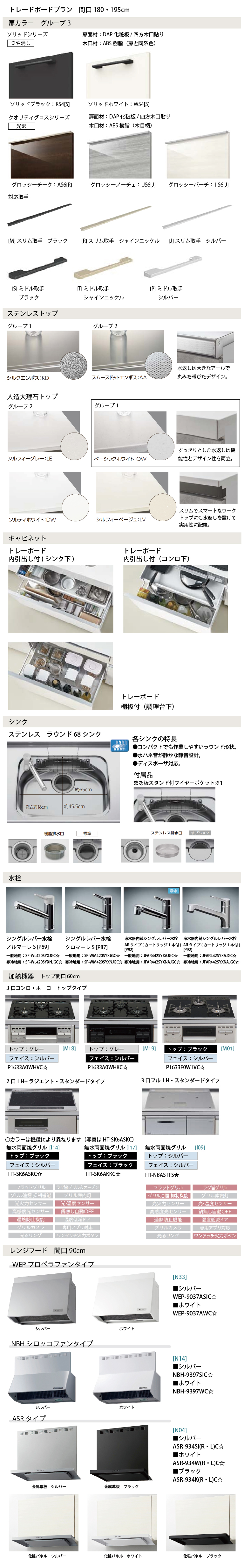 【扉グループ3】 ■ソリッドシリーズ ソリッドブラック:KS4[S]/ソリッドホワイト:WS4[S] ■クオリティグロスシリーズ グロッシーチーク:AS6[R]/グロッシーノーチェ:US6[J]/グロッシーバーチ:TS6[J]【ワークトップ】 ■ステンレストップ シルクエンボス/スムーズドットエンボス ■人造大理石トップ ベーシックホワイト/シルフィーグレー/シルフィーベージュ/ソルティホワイト【シンク】 ステンレス:ラウンド68シンク(樹脂排水口/ステンレス排水口)【水栓金具】■シングルレバー水栓 ノルマーレS[P89]一般地用:SF-WL420SYXJGC☆/寒冷地用:SF-WL420SYXNJGC☆■シングルレバー水栓 クロマーレS(シングルレバー)[P87]一般地用:SF-WM420SYXJGC☆/寒冷地用:SF-WM420SYXNJGC☆■浄水器内蔵シングルレバー水栓 ARタイプ(カートリッジ1本付)[P92]一般地用:JFAR442SYXAJGC☆/寒冷地用:JFAR442SYXNAJGC☆■ハンドシャワー水栓 クロマーレS(ハンドシャワー)一般地用:SFBE451SYXJG5★/寒冷地用:SFBE451SYXNJG5★【加熱機器】■3口コンロ・ホーロートップタイプ無水片面焼グリル(トップ:グレー/フェイス:シルバー)[M18]P1633A0WHVC☆■3口コンロ・ホーロートップタイプ 無水片面焼グリル(トップ:グレー/フェイス:ブラック)[M19]P1633A0WHKC☆■3口コンロ・ガラストップタイプ無水片面焼グリル(トップ:ブラック/フェイス:シルバー)[M01]R1633F0W1VC☆■2口TH+ラジエント・スタンダードタイプ無水両面焼グリル(トップ:ブラック/フェイス:シルバー)[I14]HT-SK6ASKC☆■2口TH+ラジエント・スタンダードタイプ無水両面焼グリル(トップ:ブラック/フェイス:ブラック)[I17]HT-SK6AKKC☆■3口フルTH・スタンダードタイプ3無水両面焼グリル(トップ:シルバー/フェイス:シルバー)[I09]HT-N8ASTFS★【レンジフード 間口90cm】■WEPプロペラファンタイプ[N33]シルバー:WEP-9037ASIC☆ホワイト:WEP-9037AWC☆■NBHシロッコファンタイプ[N14]シルバー:NBH-9397SIC☆ホワイト:NBH-9397WC☆■ASRタイプ[N04]シルバー:ASR-934SI(R/L)C☆ホワイト:ASR-934W(R/L)C☆ブラック:ASR-934K(R/L)C☆【レンジフード 横幕板】■WEPプロペラファンタイプシルバー/ホワイト:WPMC3-32510(SI・W)C☆■NBHシロッコファンタイプシルバー/ホワイト:RSP-A-300D(SI・W)C☆■ASRタイプシルバー/ホワイト/ブラック:RSP-A-665H(SI・W・K)C☆【キッチンコンセント】カラーバリエーション:シルバー/シャインニッケル/ブラック※キッチンコンセントのカラーは取手カラーによって決まります。