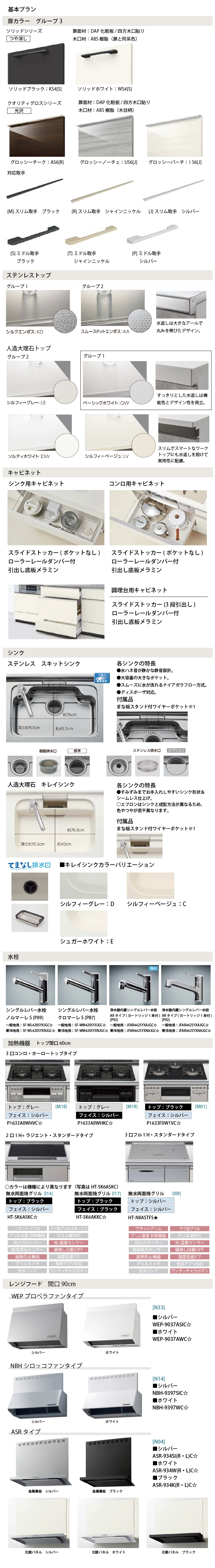 【扉グループ3】 ■ソリッドシリーズ ソリッドブラック:KS4[S]/ソリッドホワイト:WS4[S] ■クオリティグロスシリーズ グロッシーチーク:AS6[R]/グロッシーノーチェ:US6[J]/グロッシーバーチ:TS6[J]【ワークトップ】 ■ステンレストップ シルクエンボス/スムーズドットエンボス ■人造大理石トップ ベーシックホワイト/シルフィーグレー/シルフィーベージュ/ソルティホワイト【シンク】 ステンレス:スキットシンク(樹脂排水口/ステンレス排水口) 人造大理石:キレイシンク(てまなし排水口) キレイシンクカラー:シルフィーベージュ[C]/シルフィーグレー[D]/シュガーホワイト[E]【水栓金具】■シングルレバー水栓 ノルマーレS[P89]一般地用:SF-WL420SYXJGC☆/寒冷地用:SF-WL420SYXNJGC☆■シングルレバー水栓 クロマーレS(シングルレバー)[P87]一般地用:SF-WM420SYXJGC☆/寒冷地用:SF-WM420SYXNJGC☆■浄水器内蔵シングルレバー水栓 ARタイプ(カートリッジ1本付)[P92]一般地用:JFAR442SYXAJGC☆/寒冷地用:JFAR442SYXNAJGC☆■ハンドシャワー水栓 クロマーレS(ハンドシャワー)一般地用:SFBE451SYXJG5★/寒冷地用:SFBE451SYXNJG5★【加熱機器】■3口コンロ・ホーロートップタイプ無水片面焼グリル(トップ:グレー/フェイス:シルバー)[M18]P1633A0WHVC☆■3口コンロ・ホーロートップタイプ 無水片面焼グリル(トップ:グレー/フェイス:ブラック)[M19]P1633A0WHKC☆■3口コンロ・ガラストップタイプ無水片面焼グリル(トップ:ブラック/フェイス:シルバー)[M01]R1633F0W1VC☆■2口TH+ラジエント・スタンダードタイプ無水両面焼グリル(トップ:ブラック/フェイス:シルバー)[I14]HT-SK6ASKC☆■2口TH+ラジエント・スタンダードタイプ無水両面焼グリル(トップ:ブラック/フェイス:ブラック)[I17]HT-SK6AKKC☆■3口フルTH・スタンダードタイプ3無水両面焼グリル(トップ:シルバー/フェイス:シルバー)[I09]HT-N8ASTFS★【レンジフード 間口90cm】■WEPプロペラファンタイプ[N33]シルバー:WEP-9037ASIC☆ホワイト:WEP-9037AWC☆■NBHシロッコファンタイプ[N14]シルバー:NBH-9397SIC☆ホワイト:NBH-9397WC☆■ASRタイプ[N04]シルバー:ASR-934SI(R/L)C☆ホワイト:ASR-934W(R/L)C☆ブラック:ASR-934K(R/L)C☆【レンジフード 横幕板】■WEPプロペラファンタイプシルバー/ホワイト:WPMC3-32510(SI・W)C☆■NBHシロッコファンタイプシルバー/ホワイト:RSP-A-300D(SI・W)C☆■ASRタイプシルバー/ホワイト/ブラック:RSP-A-665H(SI・W・K)C☆【レール】ローラーレール ダンパー付引出し底板メラミンソフトモーションレール 底板メラミン【キッチンコンセント】カラーバリエーション:シルバー/シャインニッケル/ブラック※キッチンコンセントのカラーは取手カラーによって決まります。