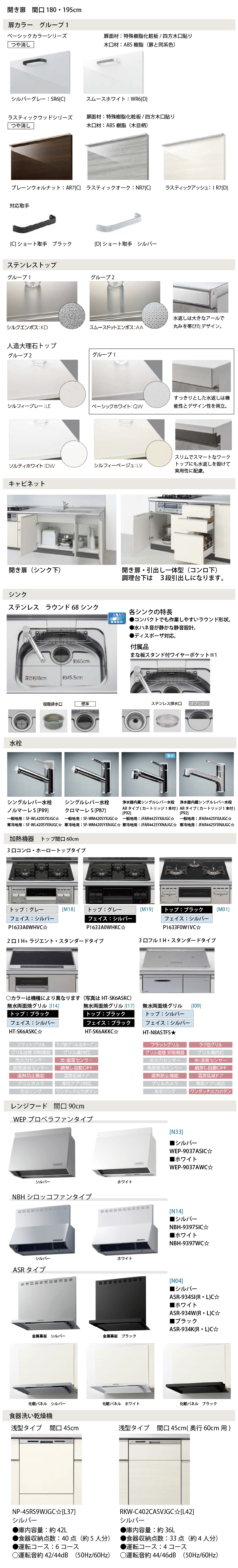 システムキッチン シエラ リクシル  間口195cm 壁付I型 奥行65cm 開き扉プラン 食洗機付 扉グループ1