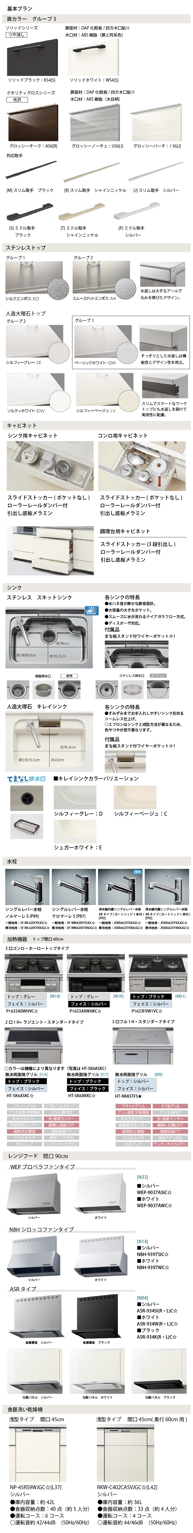 【扉グループ3】 ■ソリッドシリーズ ソリッドブラック:KS4[S]/ソリッドホワイト:WS4[S] ■クオリティグロスシリーズ グロッシーチーク:AS6[R]/グロッシーノーチェ:US6[J]/グロッシーバーチ:TS6[J]【ワークトップ】 ■ステンレストップ シルクエンボス/スムーズドットエンボス ■人造大理石トップ ベーシックホワイト/シルフィーグレー/シルフィーベージュ/ソルティホワイト【シンク】 ステンレス:スキットシンク(樹脂排水口/ステンレス排水口) 人造大理石:キレイシンク(てまなし排水口) キレイシンクカラー:シルフィーベージュ[C]/シルフィーグレー[D]/シュガーホワイト[E]【水栓金具】■シングルレバー水栓 ノルマーレS[P89]一般地用:SF-WL420SYXJGC☆/寒冷地用:SF-WL420SYXNJGC☆■シングルレバー水栓 クロマーレS(シングルレバー)[P87]一般地用:SF-WM420SYXJGC☆/寒冷地用:SF-WM420SYXNJGC☆■浄水器内蔵シングルレバー水栓 ARタイプ(カートリッジ1本付)[P92]一般地用:JFAR442SYXAJGC☆/寒冷地用:JFAR442SYXNAJGC☆■ハンドシャワー水栓 クロマーレS(ハンドシャワー)一般地用:SFBE451SYXJG5★/寒冷地用:SFBE451SYXNJG5★【食器洗い乾燥機】浅型扉材仕様[L37](奥行65cm):NP-45RS9WJGC☆(シルバー)浅型扉材仕様[L42](奥行60cm):RKW-C402CASVJGC☆(シルバー)【加熱機器】■3口コンロ・ホーロートップタイプ無水片面焼グリル(トップ:グレー/フェイス:シルバー)[M18]P1633A0WHVC☆■3口コンロ・ホーロートップタイプ 無水片面焼グリル(トップ:グレー/フェイス:ブラック)[M19]P1633A0WHKC☆■3口コンロ・ガラストップタイプ無水片面焼グリル(トップ:ブラック/フェイス:シルバー)[M01]R1633F0W1VC☆■2口TH+ラジエント・スタンダードタイプ無水両面焼グリル(トップ:ブラック/フェイス:シルバー)[I14]HT-SK6ASKC☆■2口TH+ラジエント・スタンダードタイプ無水両面焼グリル(トップ:ブラック/フェイス:ブラック)[I17]HT-SK6AKKC☆■3口フルTH・スタンダードタイプ3無水両面焼グリル(トップ:シルバー/フェイス:シルバー)[I09]HT-N8ASTFS★【レンジフード 間口90cm】■WEPプロペラファンタイプ[N33]シルバー:WEP-9037ASIC☆ホワイト:WEP-9037AWC☆■NBHシロッコファンタイプ[N14]シルバー:NBH-9397SIC☆ホワイト:NBH-9397WC☆■ASRタイプ[N04]シルバー:ASR-934SI(R/L)C☆ホワイト:ASR-934W(R/L)C☆ブラック:ASR-934K(R/L)C☆【レンジフード 横幕板】■WEPプロペラファンタイプシルバー/ホワイト:WPMC3-32510(SI・W)C☆■NBHシロッコファンタイプシルバー/ホワイト:RSP-A-300D(SI・W)C☆■ASRタイプシルバー/ホワイト/ブラック:RSP-A-665H(SI・W・K)C☆【レール】ローラーレール ダンパー付引出し底板メラミンソフトモーションレール 底板メラミン【キッチンコンセント】カラーバリエーション:シルバー/シャインニッケル/ブラック※キッチンコンセントのカラーは取手カラーによって決まります。
