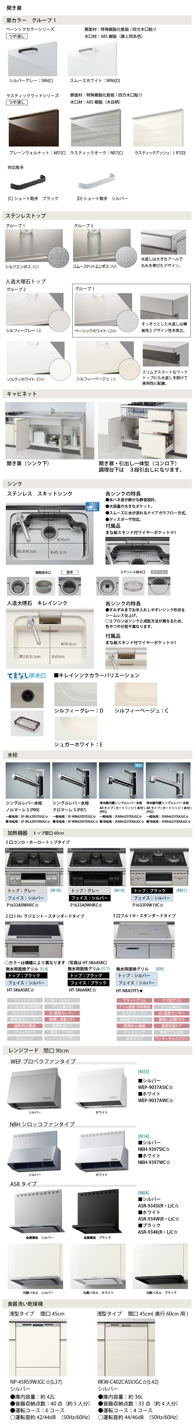 【扉グループ1】 ■ベーシックカラーシリーズ シルバーグレー:SR6[C]/スムースホワイト:WR6[D] ■ラスティックウッドシリーズ プレーンウォルナット:AR7[C]/ラスティックオーク:NR7[C]/ラスティックアッシュ:TR7[D]【ワークトップ】 ■ステンレストップ シルクエンボス/スムーズドットエンボス ■人造大理石トップ ベーシックホワイト/シルフィーグレー/シルフィーベージュ/ソルティホワイト【シンク】 ステンレス:スキットシンク(樹脂排水口/ステンレス排水口) 人造大理石:キレイシンク(てまなし排水口) キレイシンクカラー:シルフィーベージュ[C]/シルフィーグレー[D]/シュガーホワイト[E]【水栓金具】■シングルレバー水栓 ノルマーレS[P89]一般地用:SF-WL420SYXJGC☆/寒冷地用:SF-WL420SYXNJGC☆■シングルレバー水栓 クロマーレS(シングルレバー)[P87]一般地用:SF-WM420SYXJGC☆/寒冷地用:SF-WM420SYXNJGC☆■浄水器内蔵シングルレバー水栓 ARタイプ(カートリッジ1本付)[P92]一般地用:JFAR442SYXAJGC☆/寒冷地用:JFAR442SYXNAJGC☆■ハンドシャワー水栓 クロマーレS(ハンドシャワー)一般地用:SFBE451SYXJG5★/寒冷地用:SFBE451SYXNJG5★【食器洗い乾燥機】浅型扉材仕様[L37](奥行65cm):NP-45RS9WJGC☆(シルバー)浅型扉材仕様[L42](奥行60cm):RKW-C402CASVJGC☆(シルバー)【加熱機器】■3口コンロ・ホーロートップタイプ無水片面焼グリル(トップ:グレー/フェイス:シルバー)[M18]P1633A0WHVC☆■3口コンロ・ホーロートップタイプ 無水片面焼グリル(トップ:グレー/フェイス:ブラック)[M19]P1633A0WHKC☆■3口コンロ・ガラストップタイプ無水片面焼グリル(トップ:ブラック/フェイス:シルバー)[M01]R1633F0W1VC☆■2口TH+ラジエント・スタンダードタイプ無水両面焼グリル(トップ:ブラック/フェイス:シルバー)[I14]HT-SK6ASKC☆■2口TH+ラジエント・スタンダードタイプ無水両面焼グリル(トップ:ブラック/フェイス:ブラック)[I17]HT-SK6AKKC☆■3口フルTH・スタンダードタイプ3無水両面焼グリル(トップ:シルバー/フェイス:シルバー)[I09]HT-N8ASTFS★【レンジフード 間口90cm】■WEPプロペラファンタイプ[N33]シルバー:WEP-9037ASIC☆ホワイト:WEP-9037AWC☆■NBHシロッコファンタイプ[N14]シルバー:NBH-9397SIC☆ホワイト:NBH-9397WC☆■ASRタイプ[N04]シルバー:ASR-934SI(R/L)C☆ホワイト:ASR-934W(R/L)C☆ブラック:ASR-934K(R/L)C☆【レンジフード 横幕板】■WEPプロペラファンタイプシルバー/ホワイト:WPMC3-32510(SI・W)C☆■NBHシロッコファンタイプシルバー/ホワイト:RSP-A-300D(SI・W)C☆■ASRタイプシルバー/ホワイト/ブラック:RSP-A-665H(SI・W・K)C☆【キッチンコンセント】カラーバリエーション:シルバー/シャインニッケル/ブラック※キッチンコンセントのカラーは取手カラーによって決まります。